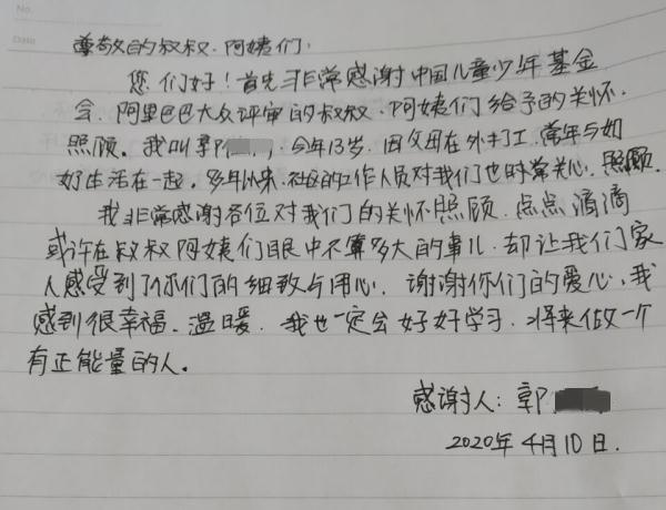 图为:一位安远县13岁孩子的感谢信